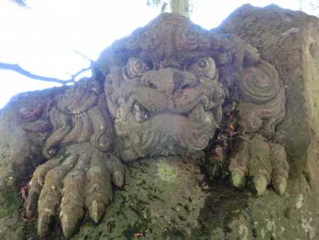 本堂周りの石に彫られたわんこがいます。
