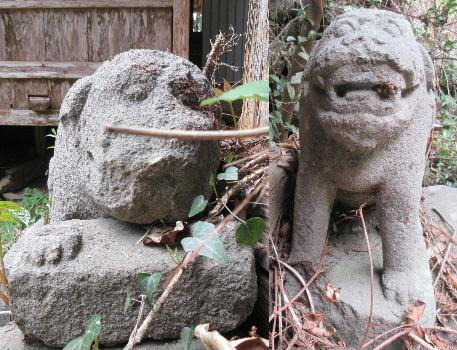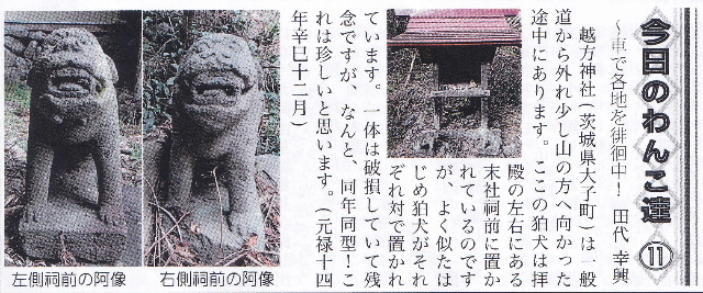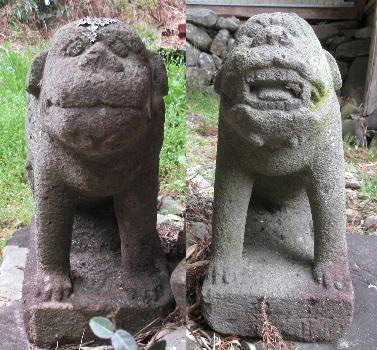 20190421 越方神社 この神社は一般道から外れ少し山の方へ向かった途中にあります。 ここの狛犬は本堂の左右に置かれているのですが、なんと同型、同年代の狛犬が置かれています。 一体は破損していて残念ですが、同型、同年代と言うのも珍しいと思います。 奉納 元禄14年 奉納 元禄14年 奉納 享和02年09月