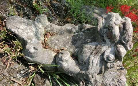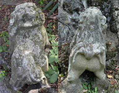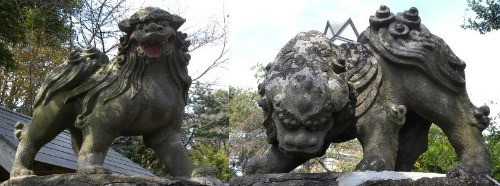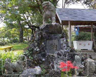 20120930 護国神社 ここの狛犬・・・ 教育熱心? 厳しい家庭? 足下に二匹の子狛犬がいます。 左、首が180度回った子狛犬。 右、一生懸命這い上がろうとしている子狛犬。 足下に一匹の子狛犬がいます。 台座から突き落とされた子狛犬。