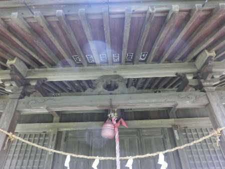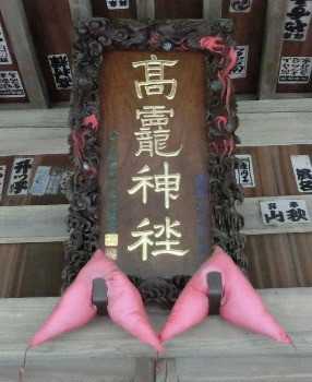 20130824 高(お)神社 (お)の字出ません。 高(お)神は水を司る神です。 この本堂・・・ 偶然??? 屋根下の彫刻の丸い穴・・・ 彫刻の後ろの額・・・ 正面から歩いて来て本堂の屋根下を見ると・・・ (お)の文字が・・・