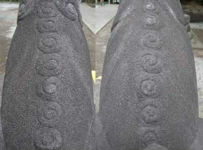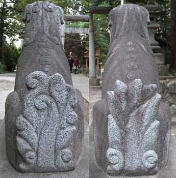 20140817 八幡神社 奉納 2003年05月 大降りの数打わんこ。 奉納 2000年04月 数打ではないこの形の平成わんこは初めて見ました。 特注品と思われる。 尻尾の表現が左右違います。 背中の円は何を表現???