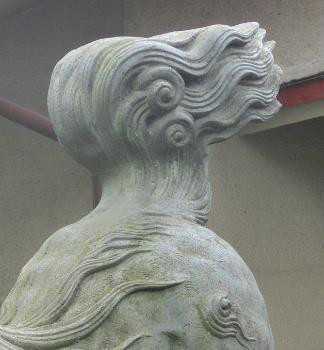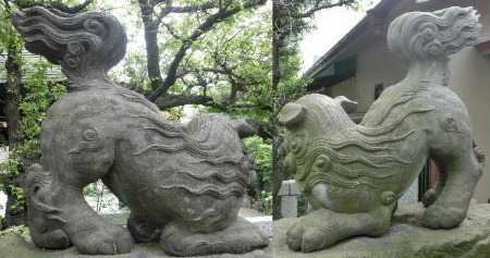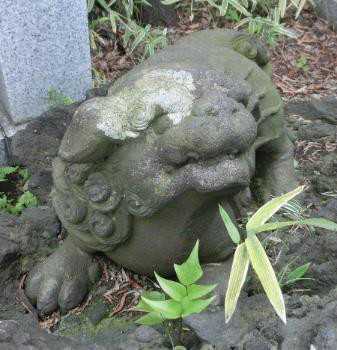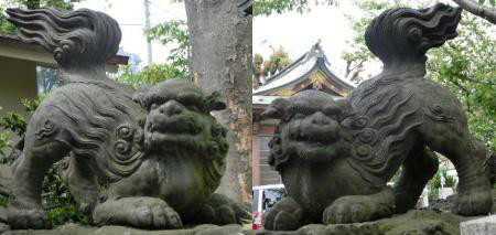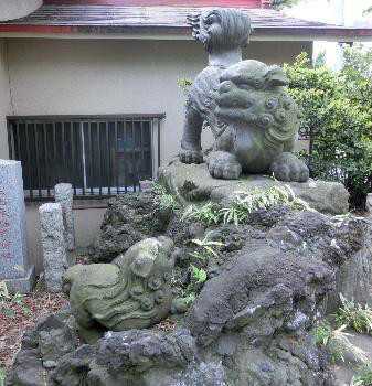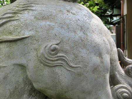20150425 氷川神社 奉納 1865年 石工 兜木文蔵 この尻尾が素晴らしい。 獅子山です。 (親獅子が子獅子を谷底に突き落とし、這い上がってきた子をはじめて我が子とするという内容を造形化したものです。) 一つ疑問・・・ 左は狛犬なのでやるなら右のライオンでは ??? 子狛犬。 よ〜く見ると・・・ 逆の卍巻き模様。