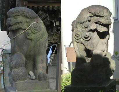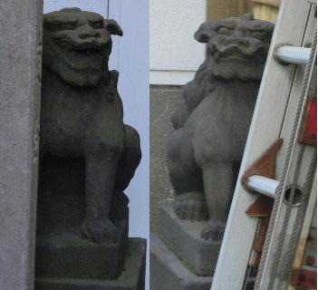20131228 高山稲荷神社 敷地が狭く、高い位置に置かれているので、写真が撮りずらい・・・ 講師の話では、正統江戸狛犬だそうです。 本堂の脇に置かれている先代。 門が閉まっていて近くに寄れませんでした。