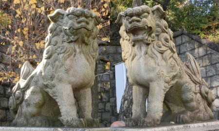 正面・鳥居前のわんこ、全国的に分布する三州岡崎のわんこです。