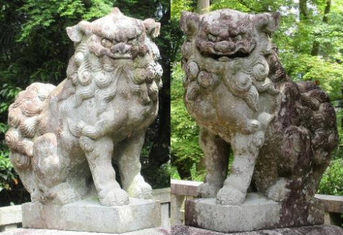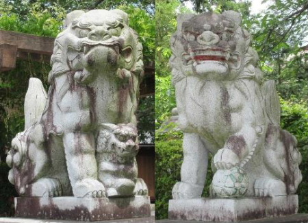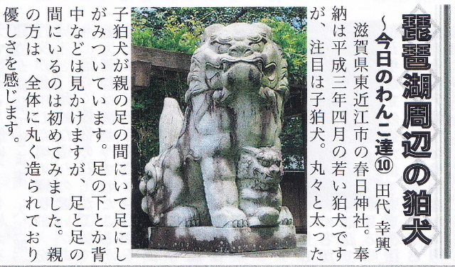 20200523 春日神社 奉納 平成03年04月 若い狛犬ですが、注目は子狛犬。 丸々と太った子狛犬が親の足の間にいて足にしがみついています。 足の下とか背中などは見かけますが、足と足の間にいるのは初めてみました。 親の方は、全体に丸く造られており優しさを感じます。 奉納 明治34年11月