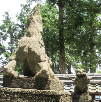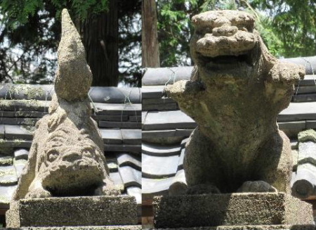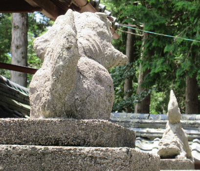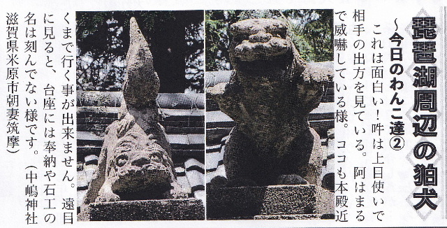 20200716 中嶋神社 これは面白い 吽・上目使いで相手の出方を見ている。 阿・まるで威嚇している様。 滋賀周辺の神社の殆どが本殿の周りを塀で囲っており門は閉まってます。 なので本殿近くまで行く事が出来ません。 遠目に見ると、台座には奉納や石工の名は刻んでない様です。